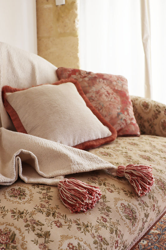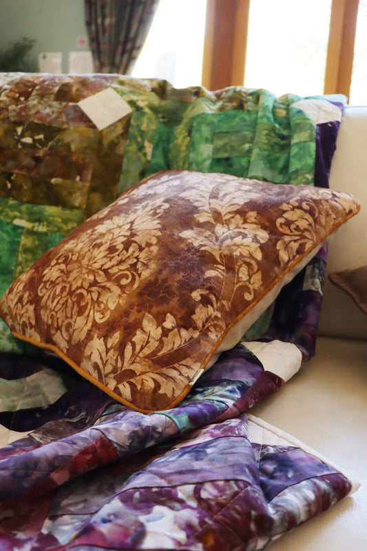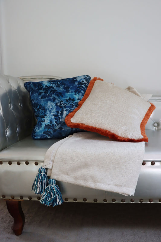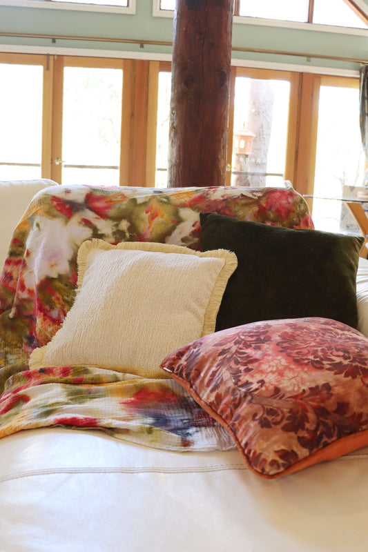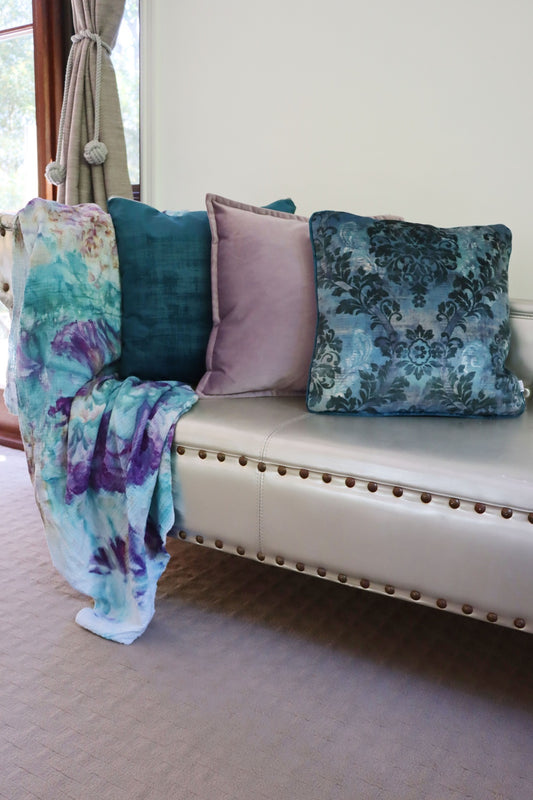 The Jayla cushion is a floral delight, swirls of colour playing together! The handmade piping is glorious textured velvet, and the back of the cushion is matching velvet. Colour and comfort on every side, just right for your relaxation time. 5 different colour blends means that there's a colour to match each couch.